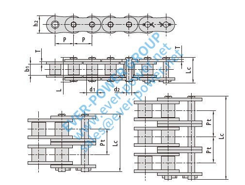 | Chain No. | ピッチ | Roller diameter | Width between inner plates | Pin diameter | Pin length | Inner plate depth | Plate thickness | Transverse pitch | Ultimate tensile strength | Average tensile strength | Weight per meter | ||||||||||||||||||||||||||||||||||||||||||||||||||||||||||||||||||||||||||||||||||||
