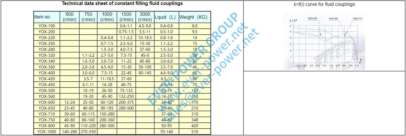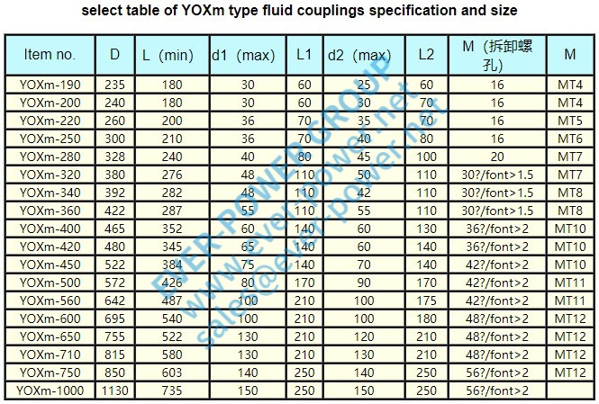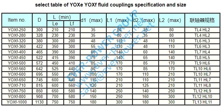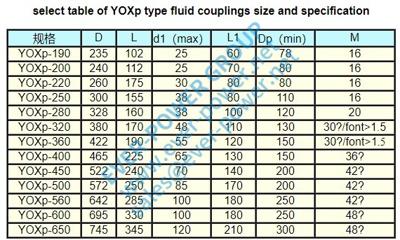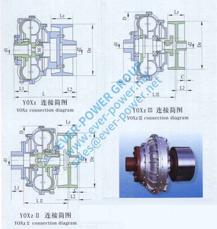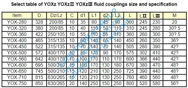 | SELECTION:Without special requirements the following technical data sheet and power chart are used to select the proper size of fluid coupling with oil medium according to the power transmitted and the speed of motor,e,i,the input of the fluid coupling. When ordering,please specify the dimensions of the shaft ends of lmotor and driven machine(or reducer)including diamenter,tolerance or fit of the shafts(if no tolerance or fit is specified,the bores will be machined th H7),fit length of the shafts,width and depth of the keys (of notice the standard No.enforced).For ordering the fluid couplings with belt pulley,brake puley or othe special requirements please state the technical data in detail.YOXz is a coincidence machine with moving wheel which is in the output point of the coincidence machine and is connected with elastic axle connecting machine (plum blossom type elastic axle connecting machine or elastic pillar axle-connecting machine or even the axle-connecting machine designated by customers). Usually there are 3 connection types. YOXz is inner wheel driver which has tight structure and the smallest axle size.The fittings of YOXz have a wide usage, simple structure and the size of it has basically be unified in the trade.The connection style of YOXz is that the axle size of it is longer but it is unnecessary to move the electromotive machine and decelerating machine. Only demolish the weak pillar and connected spiral bolt can unload the coincidence machine so it is extreme convenient. Customer must offer the size of electromotive machine axle (d1 L1) and decelerating machine axle (d2 L2). The wheel size (Dz Lz C) in the table is just for reference, the actual size is decided by customers. |