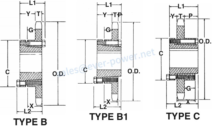| Sprocket Size | Tooth Count | Bushing | Outside Diameter | Pitch Diameter | Type | Max. Bore | Dimension (L1) | Dimension (L2) | Dimension (C) | Dimension (Y) | Dimension (P) | Dimension (G) | Dimension (X) | Weight (LBS) |