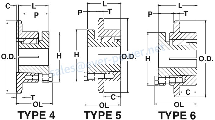 | Sprocket Size | Tooth Count | Type | Outside Diameter | Stock Bore | Recommend Max. Bore | Hub Diameter | Length Thru Bore | Weight (LBS) |