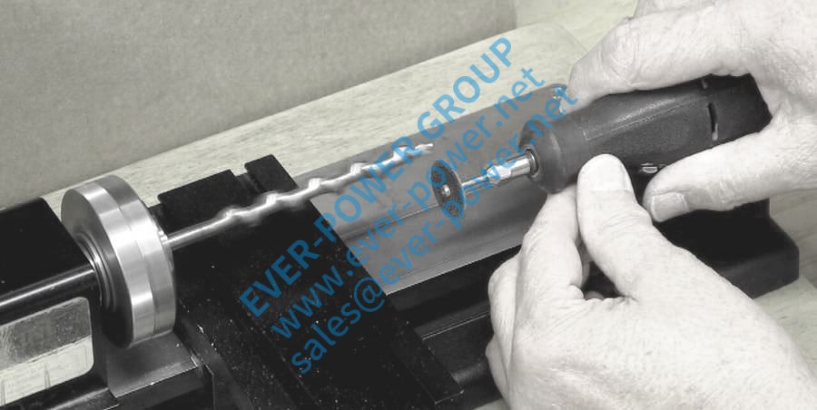 钻头末端的木螺钉、刺和切削刃以及螺旋钻的第一段(螺距较短)都需要拆除。我在台式磨床上磨掉了大部分不需要的材料。第一段被移除,因此螺旋输送器的其余部分将具有一致的螺距。把钻头放在一端,在我的小车床上车削,我用手拿着一个Dremel工具(带切断刀片),慢慢地把钻头的端部磨成一个更一致的直径。螺旋输送器的两端将居中,并用环氧树脂固定在木销钉内,以便螺旋输送器(蜗杆)在一对木垫块之间固定时能够正常运转。