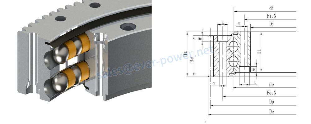 双排滚珠回转轴承有三个阀座环。钢球和隔离器可直接布置在上、下滚道内。在受力条件下,布置不同直径的上下两排钢球。这种开放式装配非常方便。上弧滚道和下弧滚道的轴承角度为75度。它能承受较大的轴向力和倾覆力矩。当径向力大于0.1倍轴向力时,滚道必须经过特殊设计。双列滚珠回转轴承的轴向和径向尺寸比较大,结构紧固。特别适用于搬运塔式起重机、汽车起重机及其他对直径有中等及以上要求的装载机和军工产品。