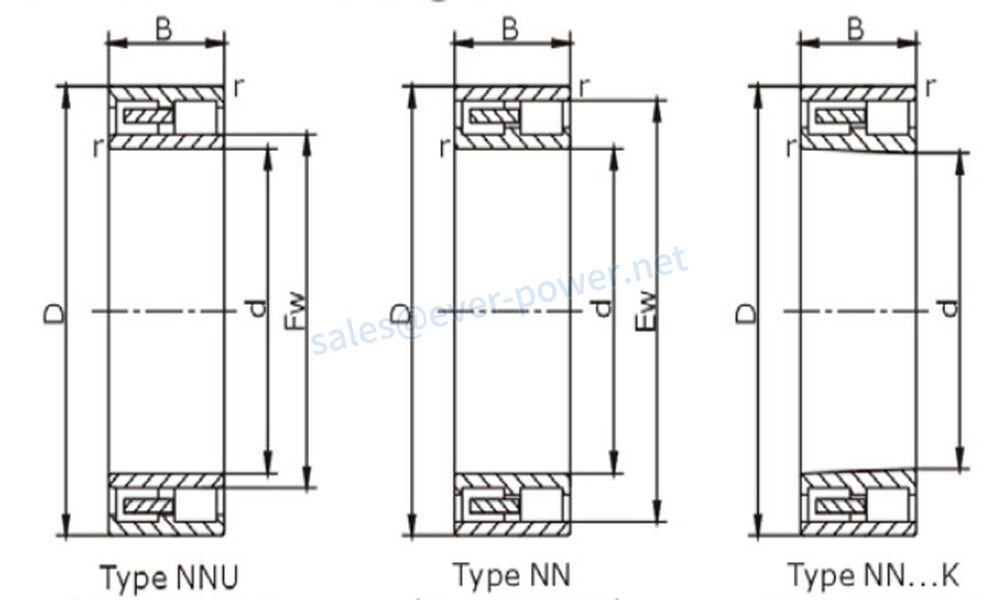 The double-row cylindrical roller bearing is one separable type bearing and easy to assemble and disassemble. The double-row cylindrical roller bearing has two optional structures: cylindrical bore and tapered bore(suffix K), and two optional designs: NNU and NN. The NN design has an inner ring with two ribs and an outer ring without ribs. The NNU design has an inner ring without ribs and an outer ring with two ribs.