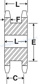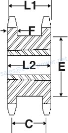 | Sprocket Size | Tooth Count | Bushing Size | Outside Diameter | Pitch Diameter | Minimum Bore | Maximum Bore | (L1) | (C) | (E) | (L2) | (F) | Weight (kg) |