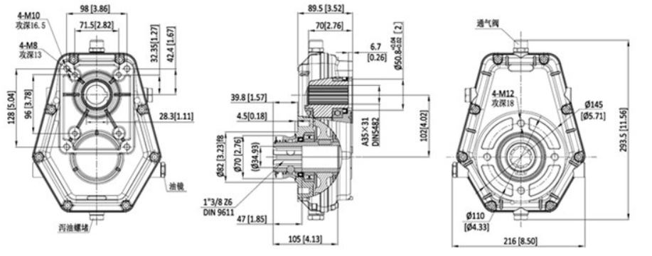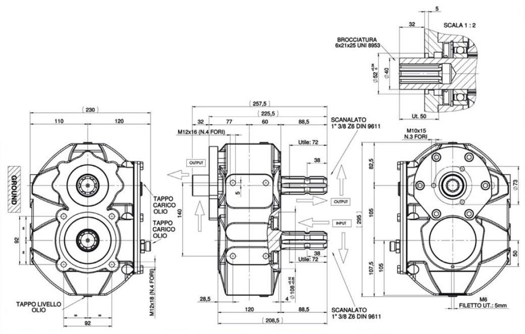 齿轮箱设计用于将齿轮泵连接到农场拖拉机电源下降(PTO)。输出电源速度耗尽为540RPM,可以与液压泵的适当运行速度进行比较。更多的输入运行速度也可以是合适的,只要PTO变速箱输出速度不超过3000 rpm。