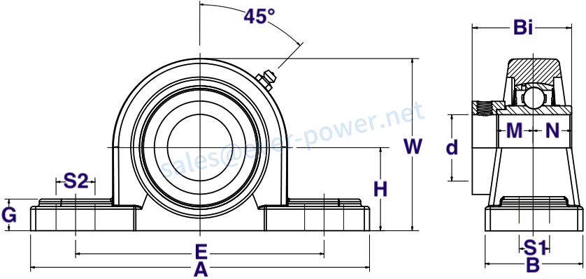 | Bearing # | Shaft Dia. | (H) | (A) | (E) | (B) | (S2) | (S1) | (G) | (W) | (Bi) | (N) | (M) | Bolt Used | Dynamic Load Rating | Static Load Rating | Bearing Insert | Housing Number | Weight (LBS) |