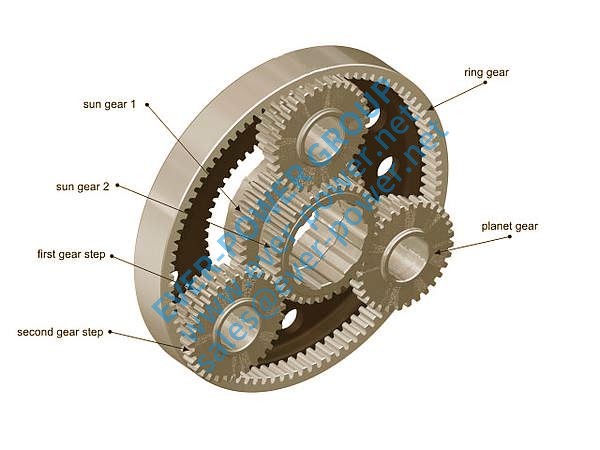 行星传动系统(也叫行星传动系统)通常由一个中心旋转的太阳齿轮、一个环形齿轮和几个行星齿轮组成。