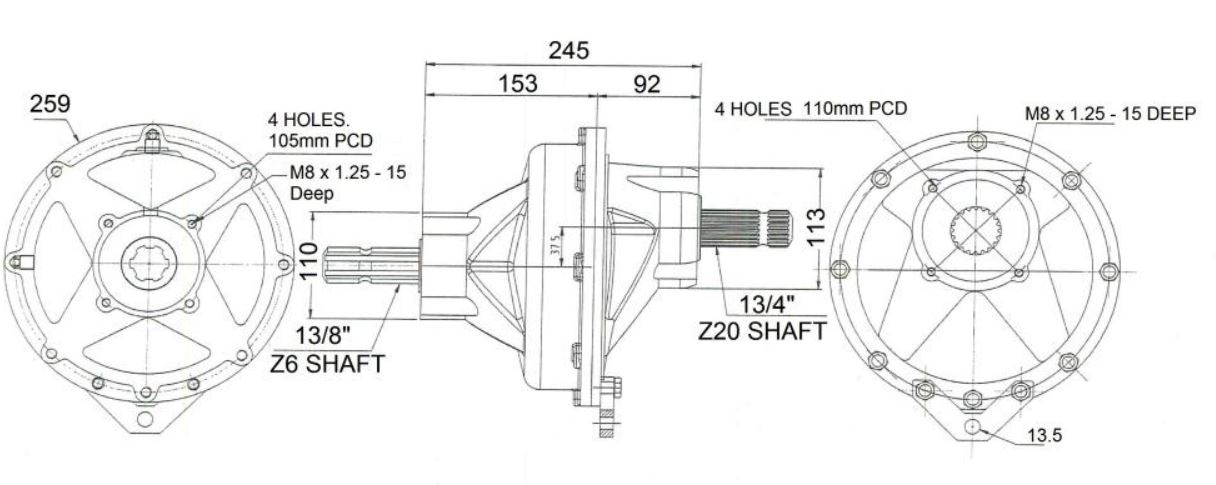齿轮箱用2×内部花芯套管组装。一个13/8“Z6另一个13/4”Z20。这些花束套管允许直接耦合到拖拉机PTO轴作为输入。齿轮箱也配有2个具有匹配花键的单独轴。这些易于组装,以为您提供所需的输出轴。