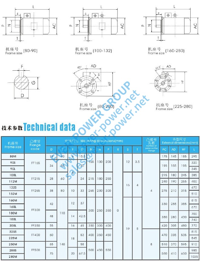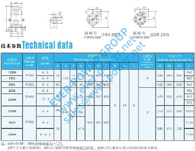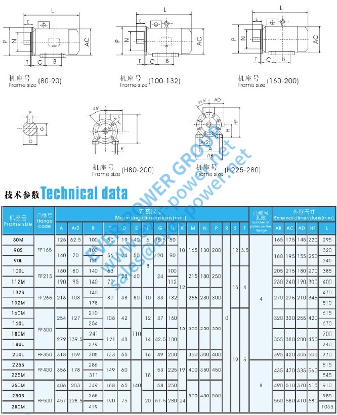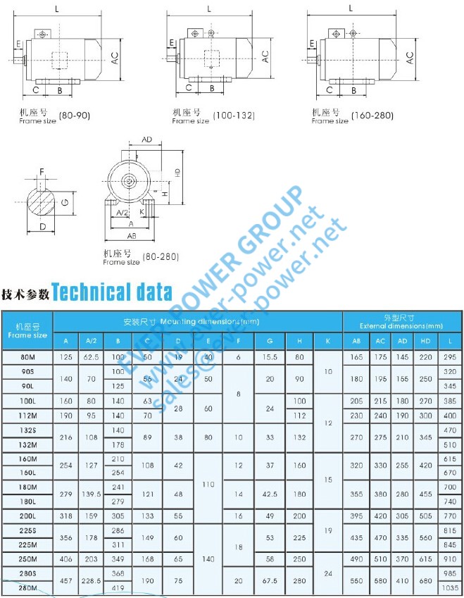 YD系列(IP54)安装尺寸、外形尺寸、绝缘程度、安全程度、冷却方式、结构、安装方式、使用条件、额定电压、频率均为Y2系列。