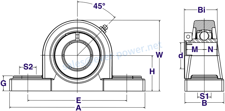| Bearing # | Shaft Dia. (in) | (H) (in) | (A) (in) | (E) (in) | (B) (in) | (S2) (in) | (S1) (in) | (G) (in) | (W) (in) | (Bi) (in) | (N) (in) | (M) (in) | Bolt Used (in) | Dynamic Load Rating | Static Load Rating | Bearing Insert | Housing Number | Weight (LBS) |