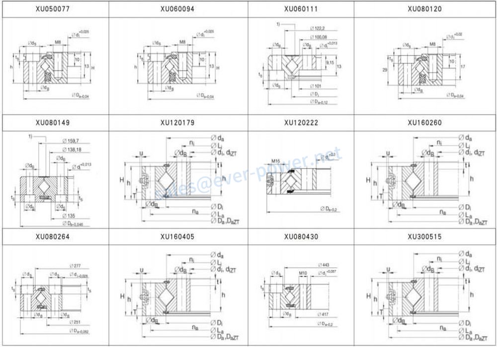 XU series crossed roller bearing is both inner ring and outer ring integrated type crossed roller bearing. Bearings are arranged between the vertically arranged rollers in the bearing to prevent the tilting of the rollers and the mutual friction between the rollers, reducing the rotational torque. In addition, compared with the previous steel plate cages, there will be no roller contact or locking phenomenon on one side.